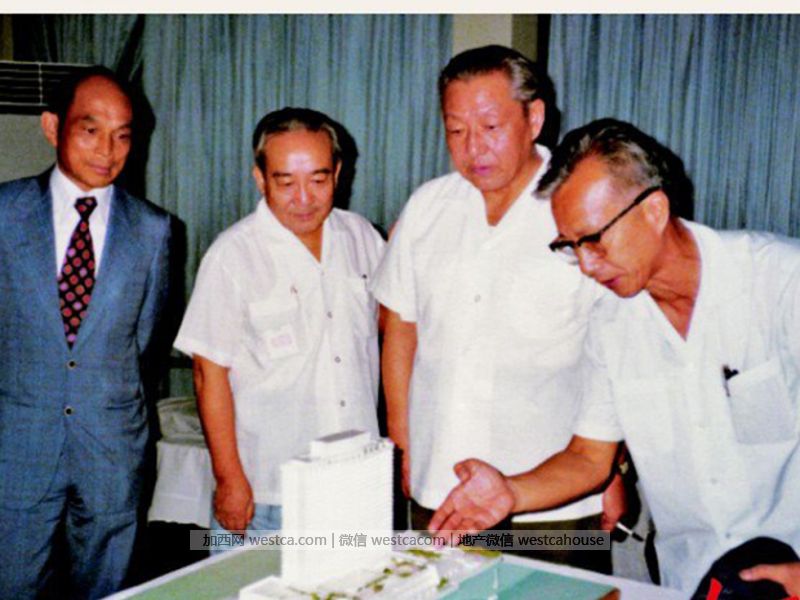 1980年夏,习仲勋(右二)与霍英东(左一)、刘田夫(左二)、王全国(右一)观看广州市白天鹅宾馆建筑模型。该宾馆是中国改革开放后第一家大型合资酒店。