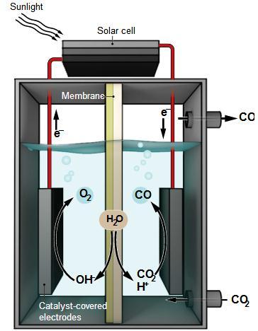 在前人的研究成果下,Gr?tzel的研究團隊使用原子沉積的方式,用氧化錫(SnO2)對氧化銅納米線電極的表面進行改性,成為贰氧化碳在電化學還原為CO時具有高選擇性的催化劑,可以將90%的贰氧化碳分子轉化為壹氧化碳。他們將這種催化劑和太陽能電池連接後發現,太陽能和壹氧化碳的自由能轉換效率為13.4%。據《科學》(Science報道,這要遠遠優於能夠以約1%的效率進行光合作用儲存能量的植物,甚至是將催化劑與微生物結合以產生燃料的最新混合方法。