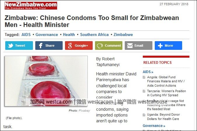 据新津巴布韦网2月27日报道,帕瑞仁雅塔瓦称,津巴布韦绝大多数安全套都是从中国进口的,因为当地不生产安全套。但部分当地人发现,这些安全套的尺寸不太合适,他们抱怨中国的安全套太小了。