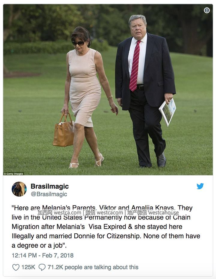 上个月Twitter上有条推文火了,图片上是川普夫人梅拉尼娅父母的照片,文字里指责他们通过“链式移民”、由梅拉尼娅为他们申请到了美国绿卡,而梅拉尼娅本人当年在美国签证过期、为了解决自己的非法身份才和川普结婚,梅拉尼娅本人和她的父母既没学历也没工作。