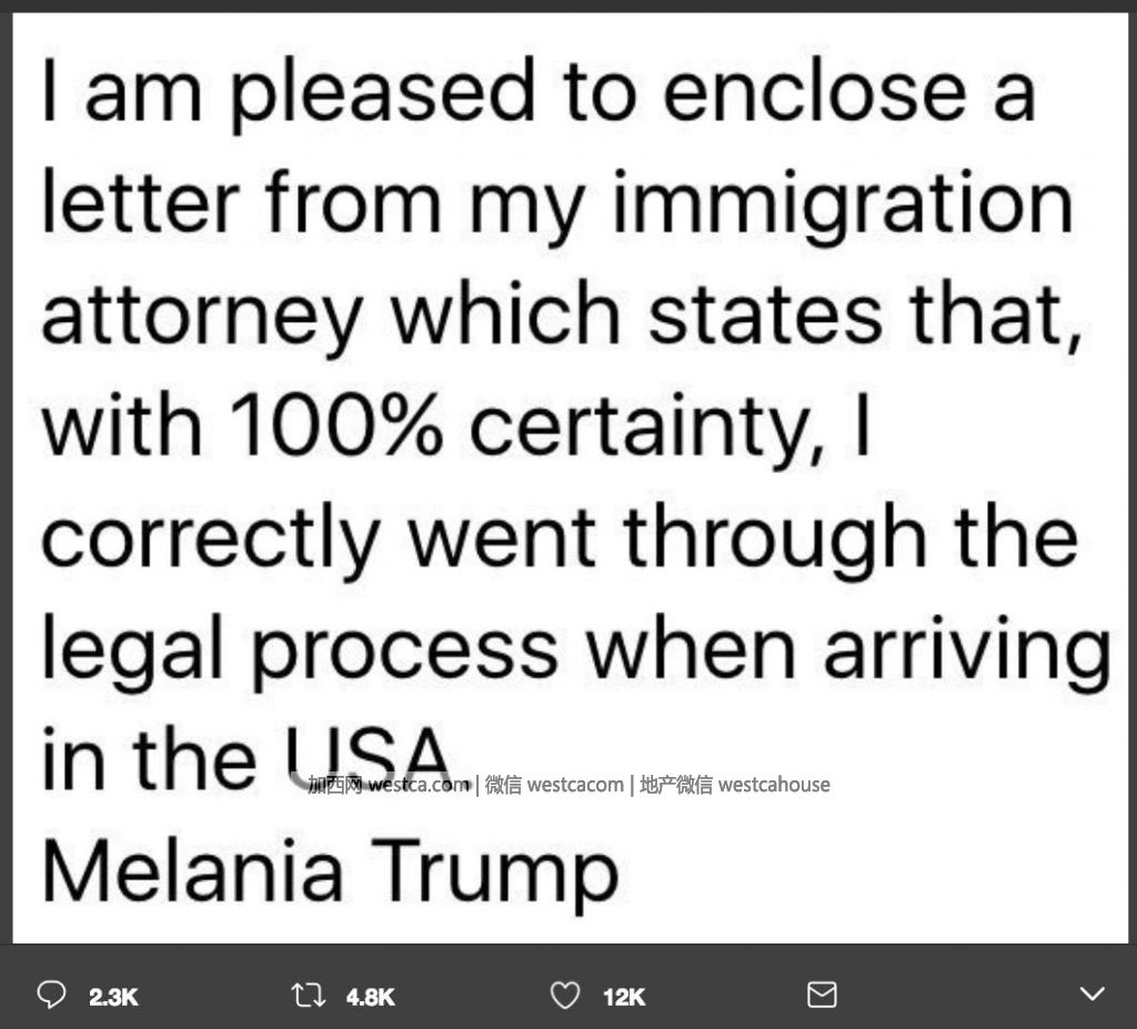 2016年9月总统大选进入白热化阶段时,媒体上充斥着各种关于梅拉尼娅移民身份的报道,为了自证清白梅拉尼娅在Twitter上公布了一封移民律师信,证明自己并非是通过婚姻获得绿卡身份的、自己当年在美国也一直都有合法身份。
