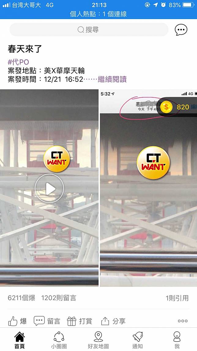 网友搭乘摩天轮时竟撞上情侣疑似在包厢内激战。 (图/翻摄自爆料公社APP)