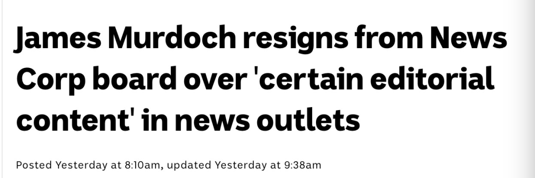 7月底,曾被当作老默多克潜在接班人的次子詹姆斯·默多克,辞去了报纸出版商新闻集团董事会的职务。