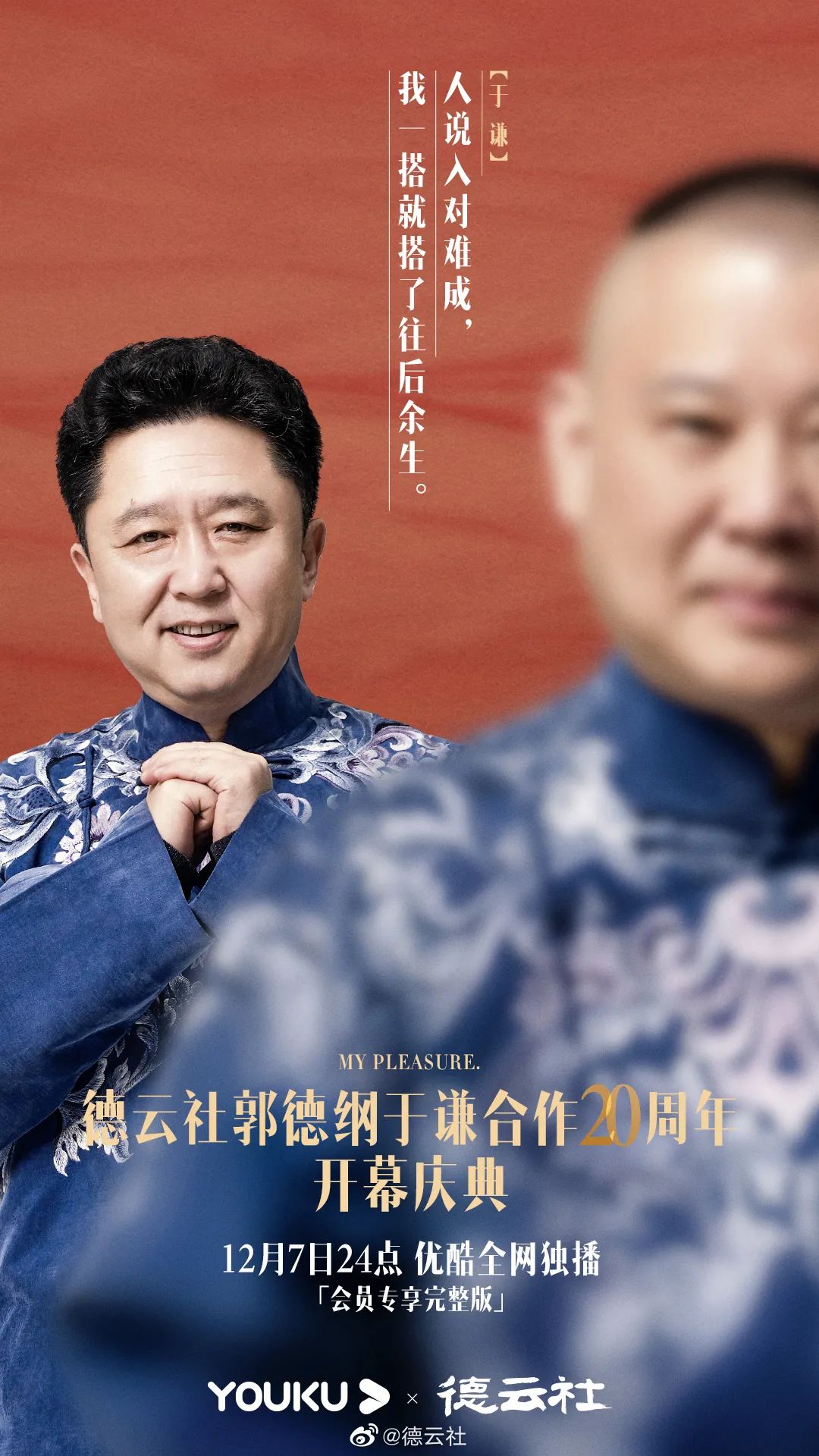 “江山父老能容我,不使人间造孽钱。”随着郭德纲这句经典开场白,台下观众的掌声与欢呼声更盛了。12月7日24时,德云社郭德纲于谦合作20周年开幕庆典在优酷全网独播。