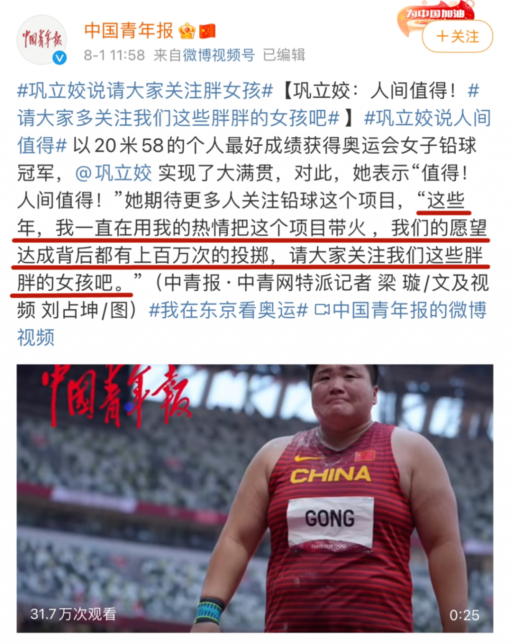 巩立姣在获奖后代表自己和所有练铅球的女孩子们向大家喊话:“请大家多关注我们这些胖胖的女孩子吧,她们都很善良的。”