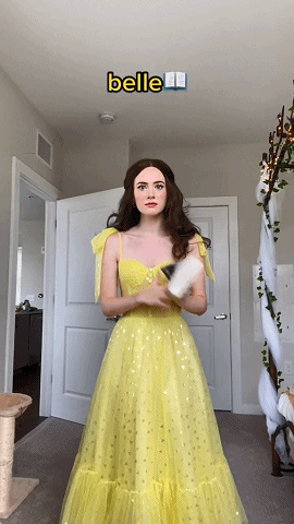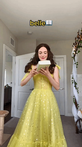 摇身一变,换上一袭黄色长裙,她又成了《美女与野兽》里的贝儿公主。