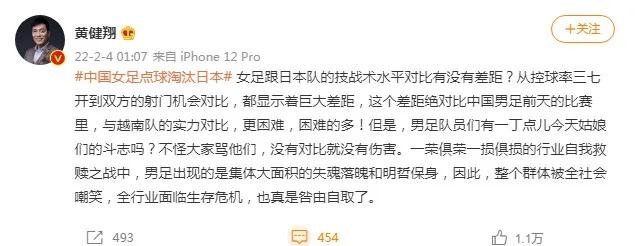 02 月 04 日讯 北京时间 2 月 3 日晚举行的女足亚洲杯半决赛中,中国女足与日本女足在 120 分钟中战成 2-2,点球大战中中国女足 4-3 战胜对手挺进决赛。赛后,着名评论员黄健翔发布微博表示中国女足本场比赛比男足踢越南要困难得多,但是男足没有一丁点儿今天姑娘们的斗志,所以被全社会嘲笑,全行业面临生存危机,也真是咎由自取了。