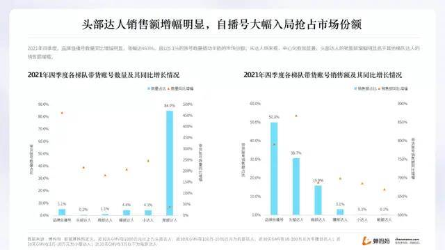 在这当中,我们也注意到越来越多品牌开始架起自己的直播间。以抖音为例,根据蝉妈妈《2021抖音电商分析报告》显示,2021年四季度,品牌自播号数量同比涨幅达463%,且以5.1%的账号数量撬动半数的市场份额。与此同时,头部达人的销售额增幅明显高于其他梯队达人的销售额增幅。