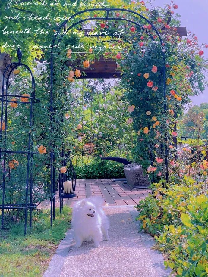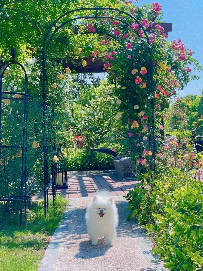 照片裡,狗狗站在伍彩斑斕的花架前,與藍天相配,無比治愈。