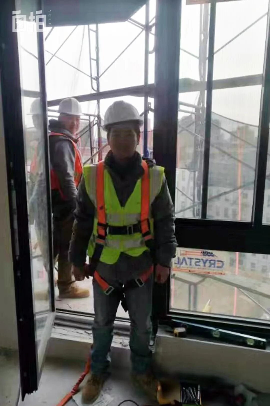 搞装修时的照片,大头鞋、反光背心、安全带、头盔,装备一样不少。