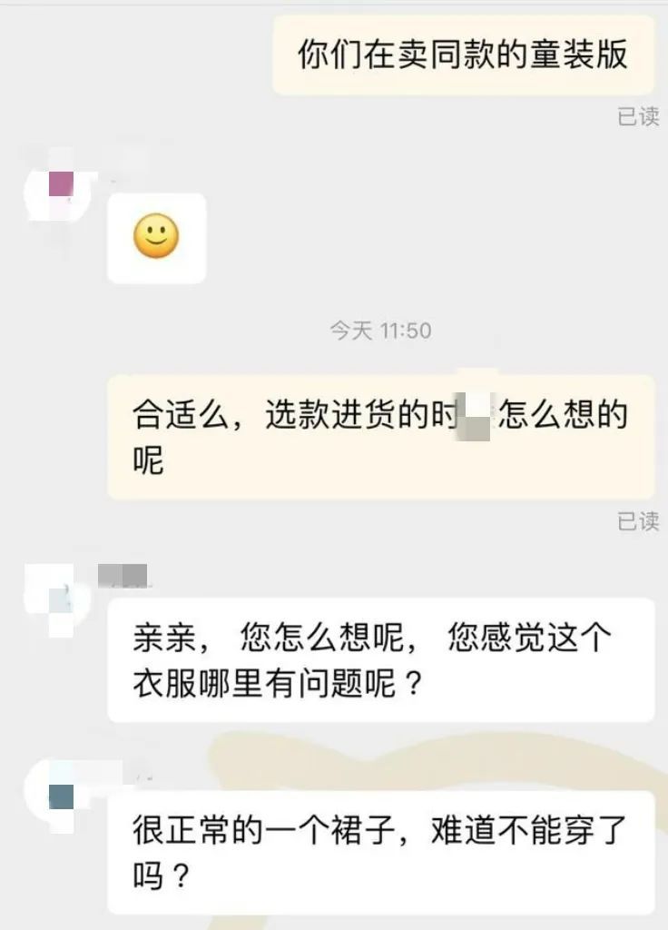 当天,记者以消费者身份询问了两家售卖该裙款的童装店客服,其中一客服人员回应称“这衣服哪里有问题呢?很正常的一个裙子,难道不能穿了吗”。另一家店的客服人员在简单沟通后,将裙子页面换为另外一款裙子。