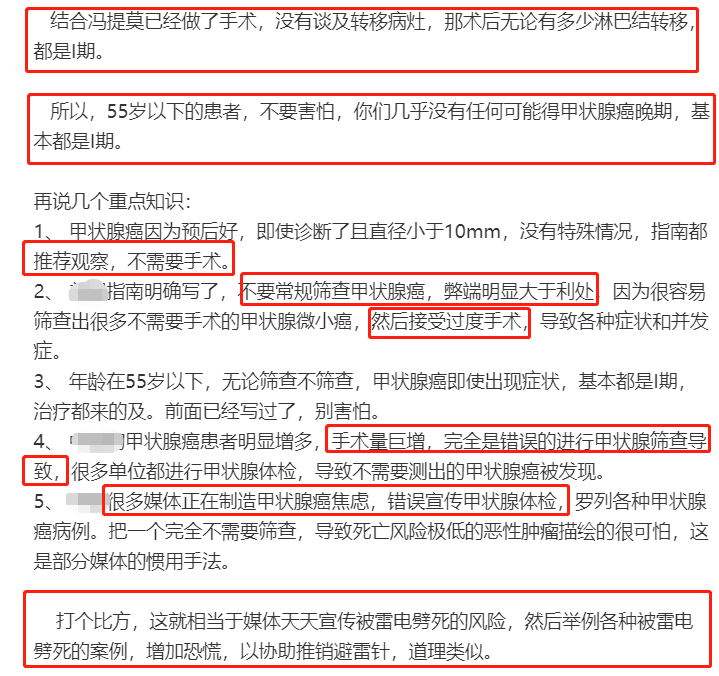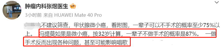 接下来,张煜医生也是说出了为什么他会站出来质疑冯提莫——“看到新闻,说冯提莫患甲状腺癌恶性晚期,已经接受了手术治疗。估计又会让很多年轻人心里害怕,又去做无用的甲状腺B超筛查,可能又查出很多不需要治疗的甲状腺癌”。