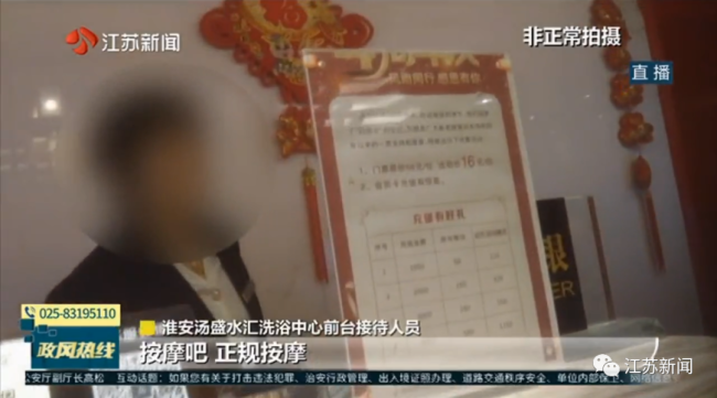“湯盛水匯正常營業的,裡面可以洗澡的,洗完澡了拿壹身衣服給你,你就可以上樓,上樓了以後就有人給你安排,安排色情服務就來了,都是違法的。”知情人表示。