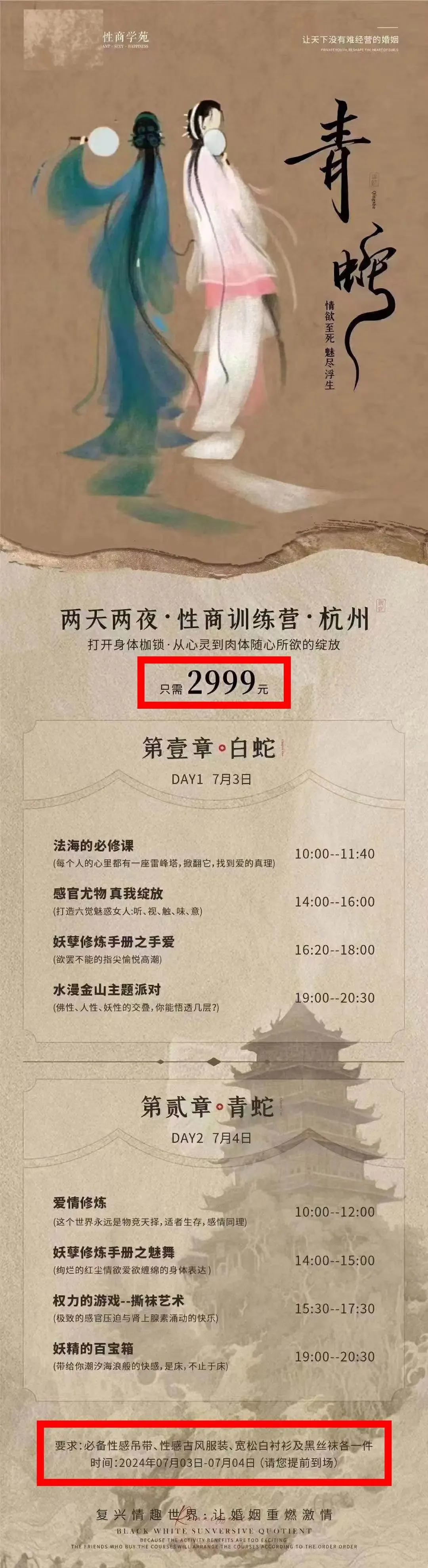 这个计划本月初在杭州开拔的性商训练营,时长两天两夜,一位收费2999,明文要求必备性感吊带、性感古风服装、宽松的白衬衫还得有黑丝袜各一件。