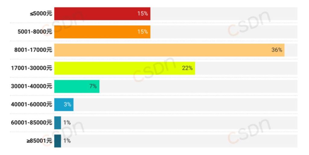 數據顯示,大部分開發者的薪資水平集中在 8001-17000 元之間,占比達到了36%。而薪資水平在 5000 元以下和 5001-8000 元之間的開發者占比分別為15% 和 15%,這壹區間整體比例基本與去年持平。