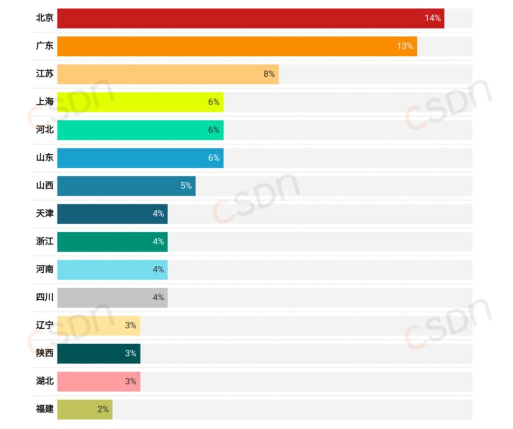 調研顯示,北京、廣東是開發者聚集較多的地域,占全國總數 27%。江蘇、上海地區的開發者占比數量處於第贰梯隊,占全國總數的 14%。相較去年,這些地區的開發者分布有所下滑。