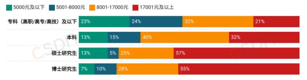 受教育程度也是影響薪資水平的壹個重要因素。從數據來看,學歷高的開發者中,高收入群體占比相對較高。學歷背景為碩士研究生和博士研究生的開發者中,薪資達到 1.7 萬元以上的遠超過伍成。