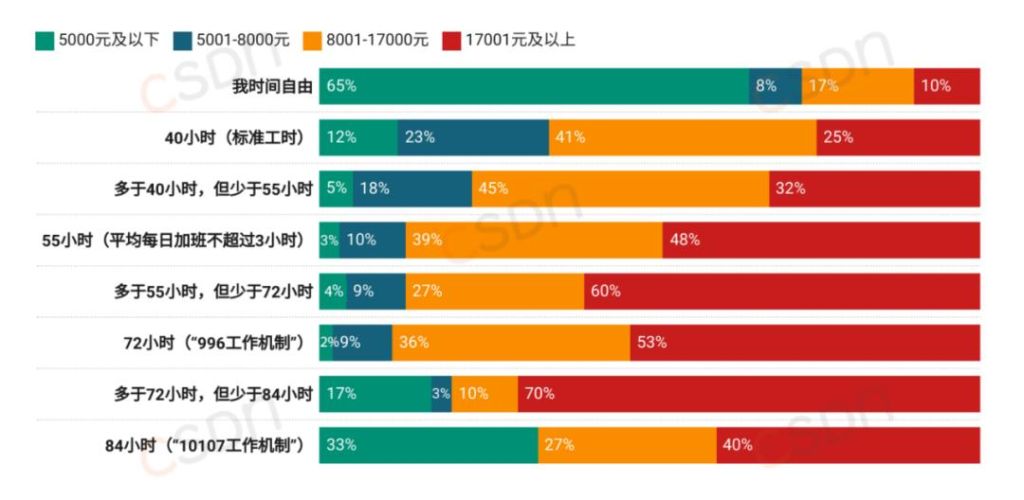 數據顯示,在工作時長多於 72 小時但少於 84 小時的開發者中,收入超過 1.7 萬元的占比最高,為 70%。