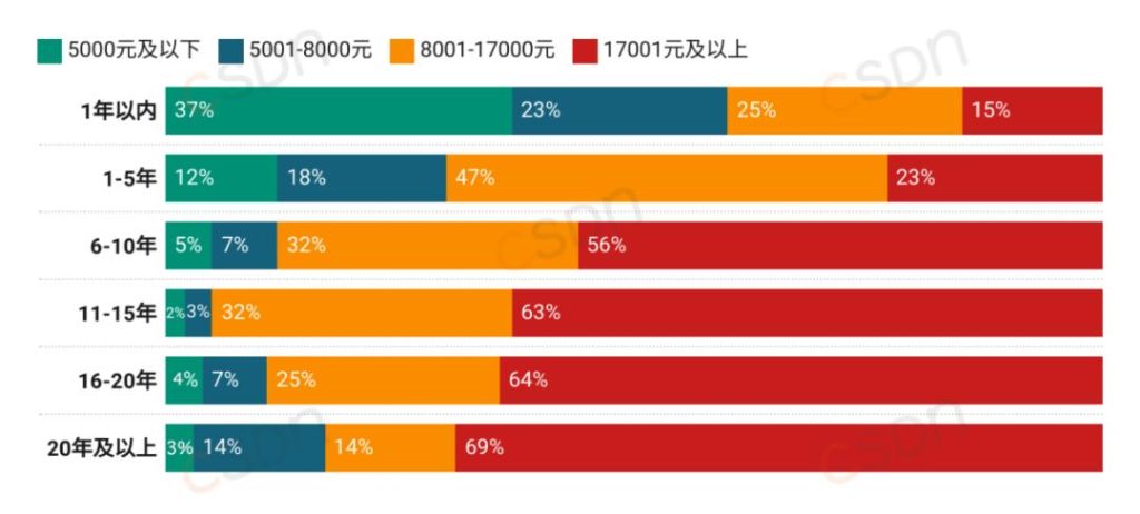 開發者的工資會隨著工齡增加而增長,工作 11 年及以上的開發者中,超六成的開發者薪資在 1.7 萬元以上,其中工作 20 年及以上的受訪者中,69% 的開發者薪資超過了 1.7 萬元。