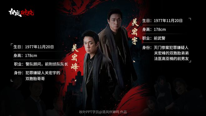 而关宏峰、关宏宇这对双胞胎 (潘粤明饰) ,在没日没夜、通宵达旦查案的间隙,居然也偷偷掌握了 PPT 这项技能!