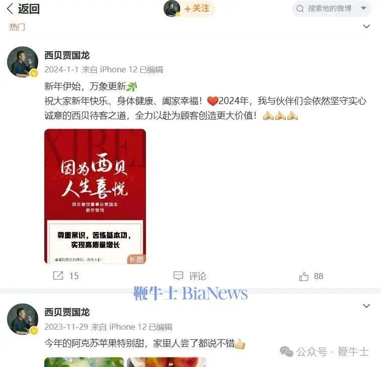 当然,罗永浩的@在微博应该不会有回应,毕竟西贝创始人贾国龙的微博基本上无更新,上次表达要起诉罗永浩也是在线下。