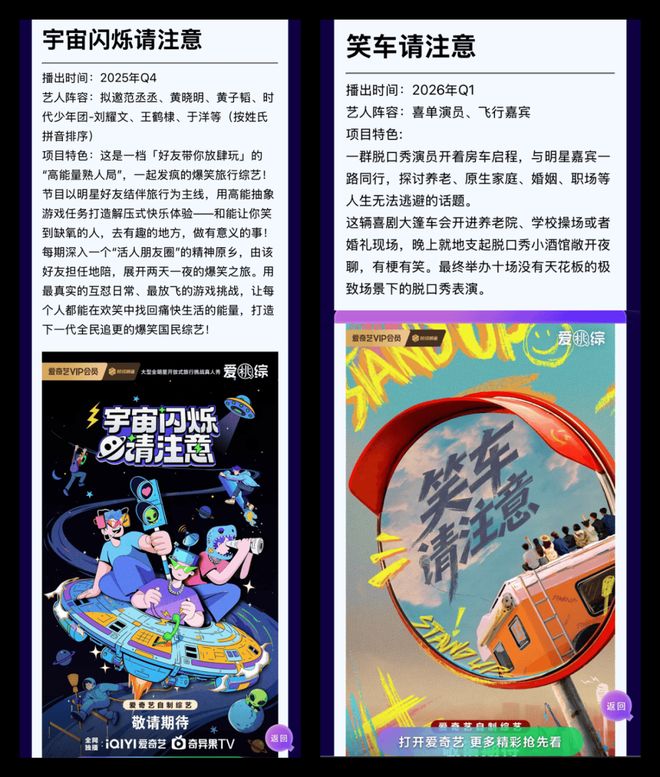 这次片单主打群像的项目还有《笑车请注意》《超燃青春的合唱》,前者被定位为喜单单口喜剧演员开着房车进行脱口秀巡演和合宿的喜剧人群像综艺,后者拟邀窦靖童、黄子弘凡等Z世代青春歌手托举起合唱团群像综艺,“脱口秀房车之旅”和“新声代合唱团”的原创属性都比较显着。