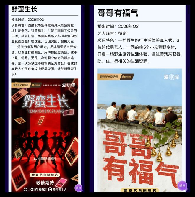 还有首度把今天很火的“团播”从短视频直播生态搬到综艺舞台的创意项目。《野蛮生长》主打24小时直播型团综,听说会彻底打破传统的录制剪辑制作路径,强调“实时数据即赛果”的呈现方式,把直播带货、直播社群融入长综艺叙事场域,是关于场景即内容的一次实验性试探。