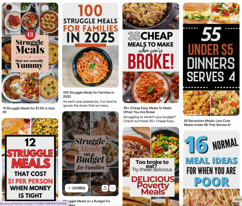 Pinterest 加拿大数据显示,“struggle meal”这个关键词在过去一年里热度持续上升,尤其是在 25 至 34 岁用户群体中。热门搜索包括:“家庭省钱餐”、“没钱时可以做的 35 道便宜菜”和“现代预算下的萧条时期料理”。