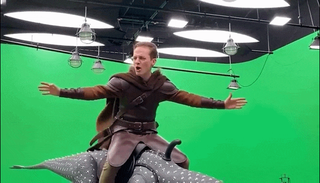 拍摄现场搭建起绿幕和相关道具,演员骑在飞龙模型上频频失误,最后摔落。