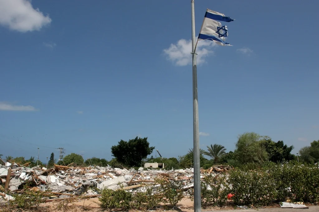 2005年9月8日,加沙地带,原内夫德卡利姆定居点被拆毁的犹太定居者房屋废墟上,一面破损的以色列国旗在飘扬。视觉中国 图