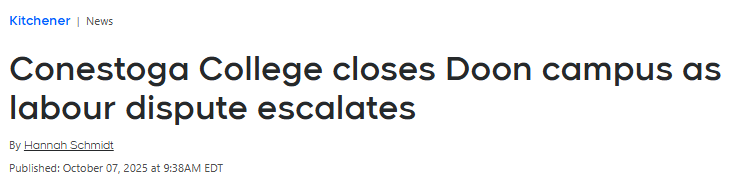 今天(10月7日)上午,康尼斯托加学院在官网发布紧急通知:由于预计校内将出现大规模纠察行动(large-scale picketing),位于滑铁卢的Doon校区课程与活动全部暂停。
