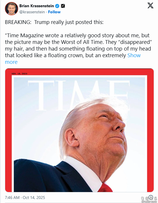 美國《時代》雜志13日預告封面人物正是川普,以“他的勝利”為封面標題揭露當期最重要的報道。川普覺得報道內容不錯,但封面照片惹毛了他,叁更半夜發文怒稱“史上最糟”。網友則注意到這張照片揭露川普也很可觀的“另壹面”。