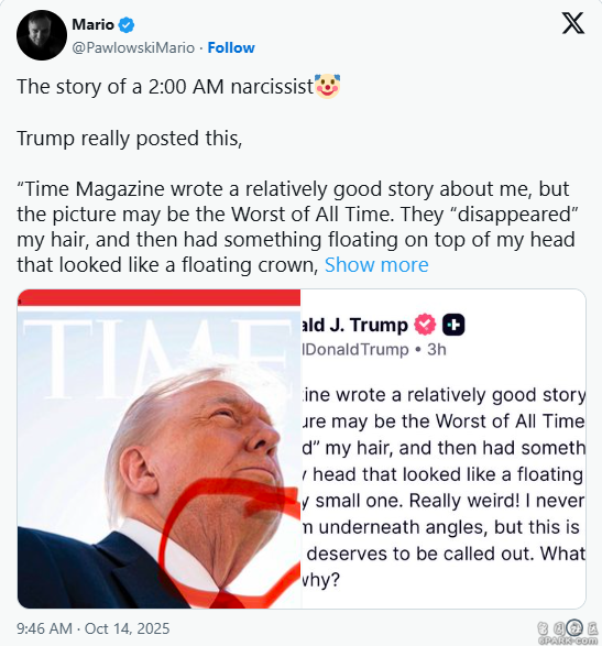 除了川普在意的拍攝視角與發型,不少人關注的是封面照片裡川普下顎到頸部松垮垮皺巴巴的皮膚。有網友看了川普半夜批評《時代》的貼文之後眉批開酸“凌晨2時的自戀狂”,也有人笑稱“《時代》對川普真的很超過”、“這是在展示川普好的壹面嗎?”。