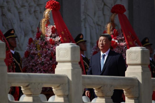 9月30日,中国国家主席习近平在北京天安门广场。本文作者认为,习近平领导下的中国是“‘颠覆型统帅’川普面临的最大挑战”。图片来源:CASARES/EPA/SHUTTERSTOCK/SHUTTERSTOCK