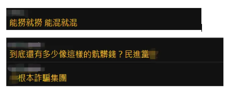 在网络论坛PTT上,有网民留言表示,“能捞就捞,能混就混”“到底还有多少像这样的肮脏钱?民进党当局根本是诈骗集团”。