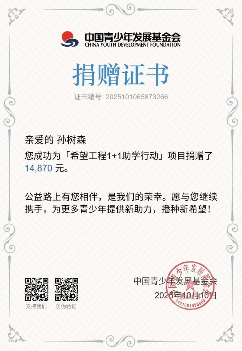 10月中旬,孫樹森將上述兩起訴訟獲得的賠償款1.4萬余元,捐贈給了中國青少年發展基金會“希望工程”。