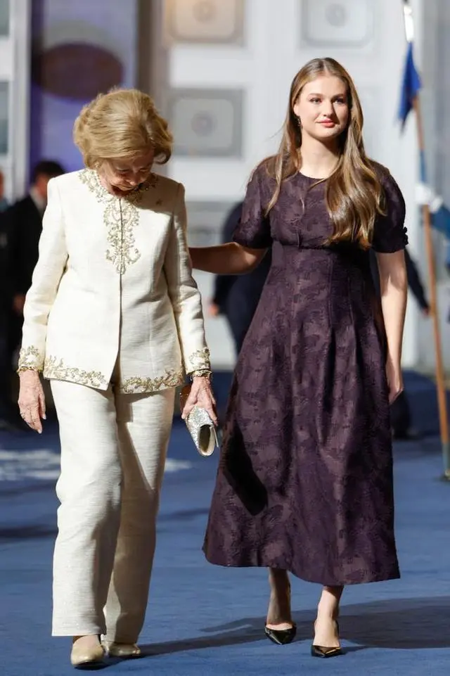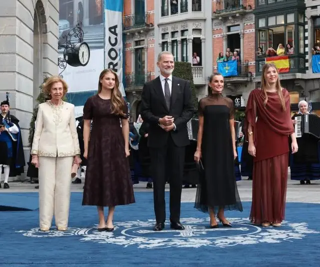 西班牙王室祖孙三代齐聚“红毯”,展现出家族的团结一致。索菲亚王太后虽然即将年满87岁,但看起来气色不错,也保持着一如既往的端庄优雅,不愧是曾经的希腊公主。极具身高优势的国王费利佩六世,占据了C位,颇有些家庭顶梁柱的感觉。