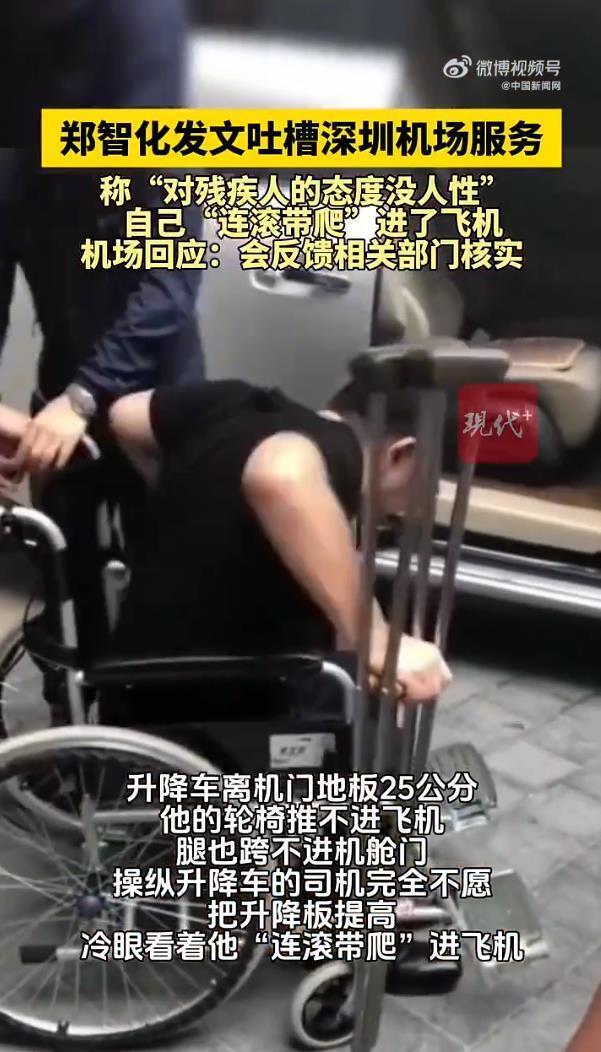 10月25日,郑智化在微博发文炮轰深圳机场对残疾人“最没人性”。他描述了一段狼狈的登机经历:机场升降车与机舱门存在25公分高度差,轮椅无法推进,自己腿部无力跨越,而司机拒绝调整设备,最终“冷眼看着我连滚带爬进飞机”。他强调,这一过程带来的心理伤害远大于身体不适。