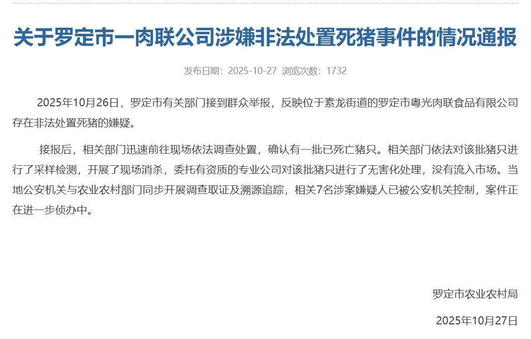 27日晚,罗定市农业农村局发布通报称,10月26日,罗定市有关部门接到群众举报,反映位于素龙街道的罗定市粤光肉联食品有限公司存在非法处置死猪的嫌疑。接报后,相关部门迅速前往现场依法调查处置,确认有一批已死亡猪只。相关部门依法对该批猪只进行了采样检测,开展了现场消杀,委托有资质的专业公司对该批猪只进行了无害化处理,没有流入市场。当地公安机关与农业农村部门同步开展调查取证及溯源追踪,相关7名涉案嫌疑人已被公安机关控制,案件正在进一步侦办中。