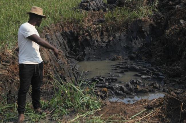 蒂米·卡賓德拉的家裡有肆個魚塘受到泄漏污染。他指著壹個正在建設中的新池塘。
