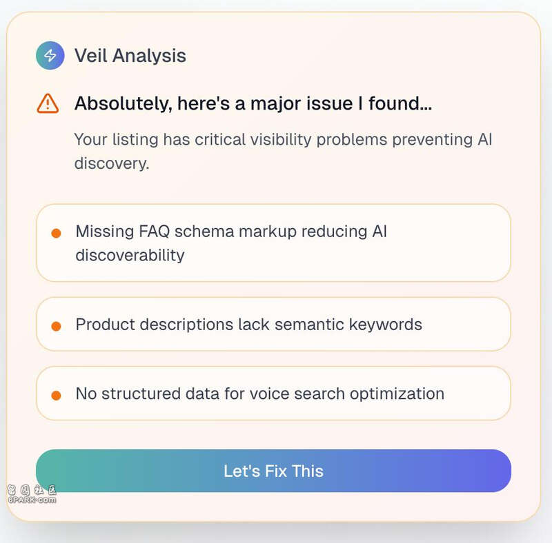 具体而言,Veil会先分析你的商品详情,然后运用GEO(生成式引擎优化) 和 AEO(问答引擎优化) 两种技术,找出那些让AI「看不清」、「听不懂」的地方。