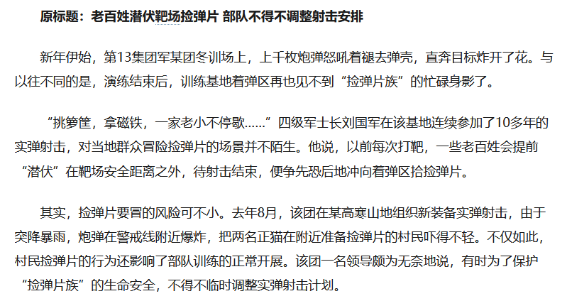但問題是,他可以不要命的沖進靶場撿炮彈皮,但部隊可受不了這個啊。壹旦發現有人侵入訓練場,訓練部隊就得立即停火確保對方的安全。如果打靶的時候老鄉壹個接壹個的沖過來,那部隊還訓不訓練了?