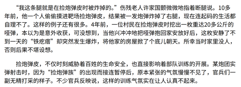 很顯然,這樣的規定也沒有完全震懾住這幫撿炮彈皮的人,還是有人鋌而走險。我其實對此非常理解:他們為了這麼點小錢,連自己和家人的命都不在乎,又怎麼會怕坐牢呢?不過這樣壹來,部隊也終於算是有辦法對付這些屢教不改的狗皮膏藥了。