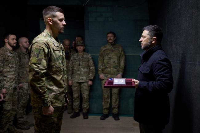 11月4日,乌克兰总统泽伦斯基前往前线城市波克罗夫斯克附近,向当地守军慰勉与颁奖。(图/美联社)