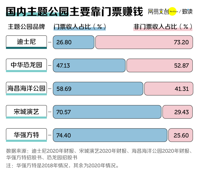 ▲迪士尼靠门票收入相较于其他乐园占比更低,更多倚靠强大的IP经济 图片来源:网易数读