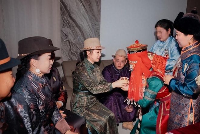 照片中,玲花的造型充滿地域特色又不失精致。她扎起烏黑長發,頭戴壹頂淺色編織帽,身上的綠色蒙古袍繡著細密花紋,襯得她身材豐腴勻稱,盡顯蒙古姑娘的端莊大氣。新人向她敬茶時,她雙手鄭重接過茶水,眼神溫柔笑意淺淺,褪去舞台上的颯爽,多了幾分長輩的慈愛。坐在她身旁的徐明朝,戴著與玲花同款的編織帽,紫色蒙古袍與妻子的綠色服飾形成鮮明對比,卻透著藏不住的情侶默契。結婚14年的兩人,眉眼間的神態越來越相似,網友忍不住調侃“這夫妻相簡直藏不住”。