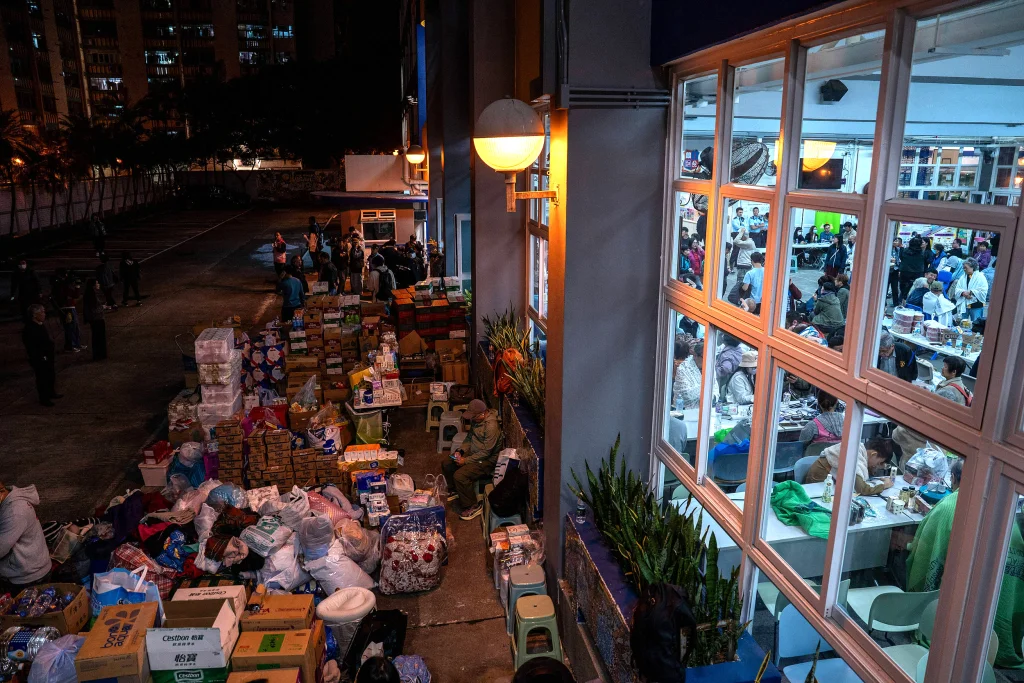 11月27日,香港大埔,宏福苑附近的广福邨公众平台上,社区关爱队和热心市民等在整理纸尿裤等捐赠物资。