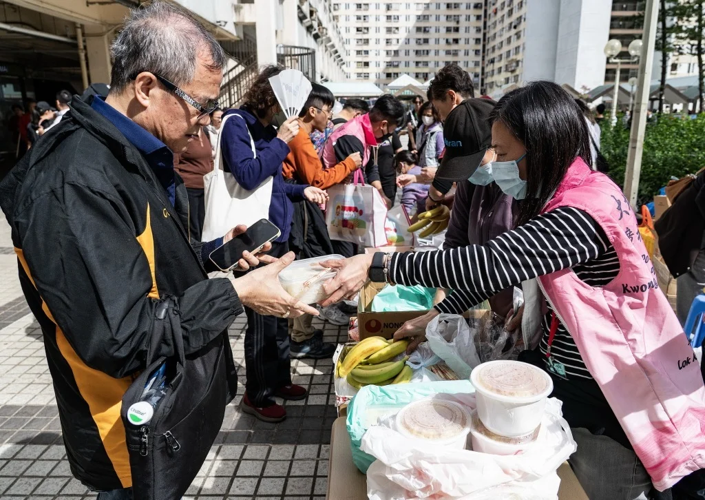 11月27日,香港宏福苑附近的广福邨公众活动平台上,社区关爱队和热心市民等为有需要者分发餐食。