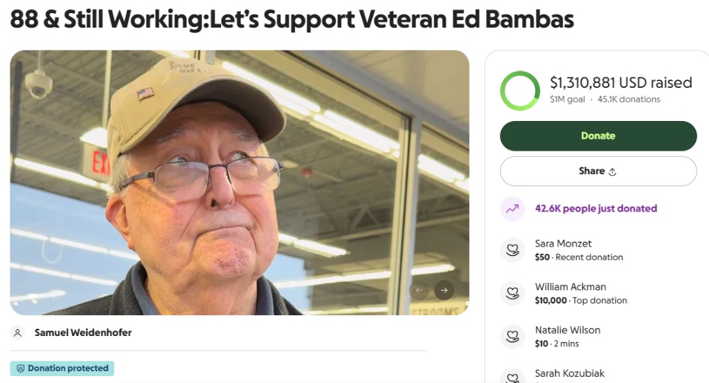 “埃德 88 岁了,是陆军老兵,还每天工作八小时,一周五天”,萨姆·魏登霍弗在 GoFundMe 上写道,“他一生辛勤工作,却从未领到应得的退休金”。