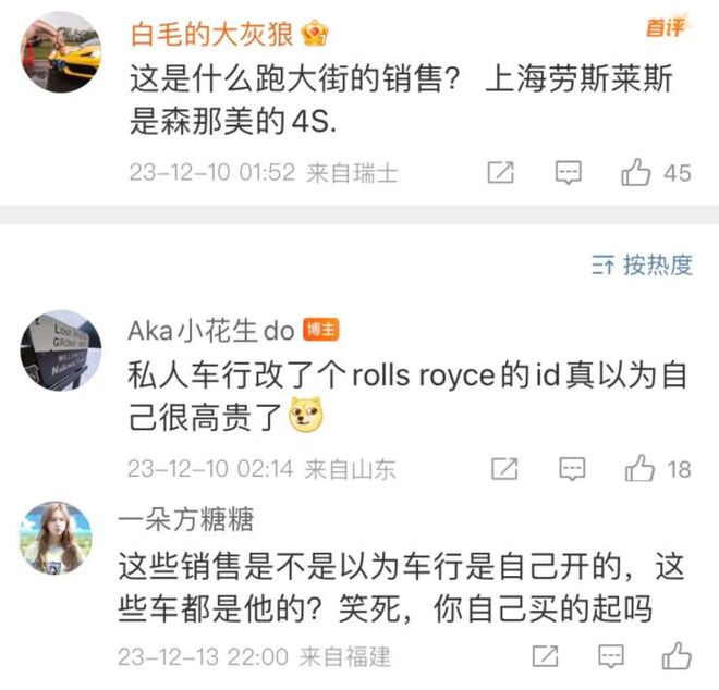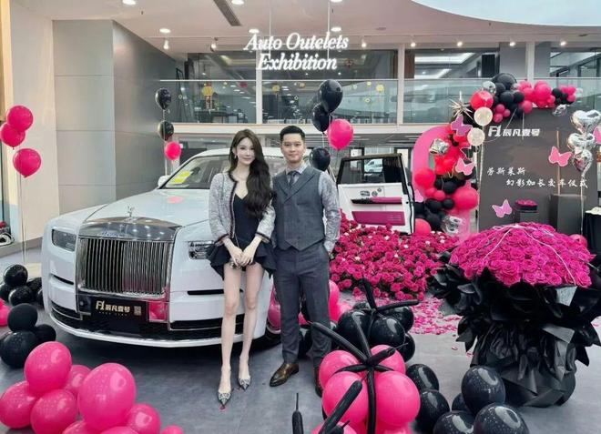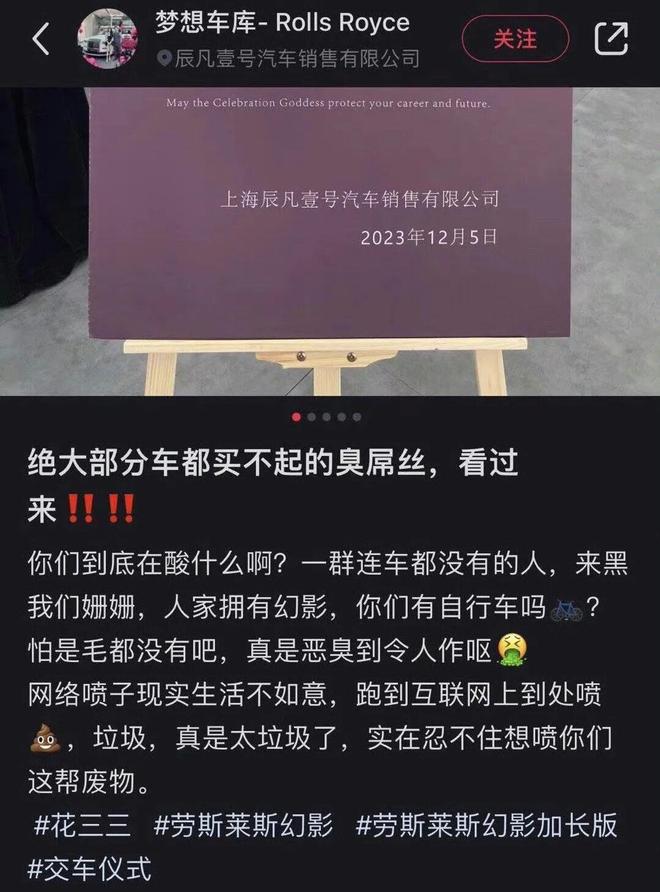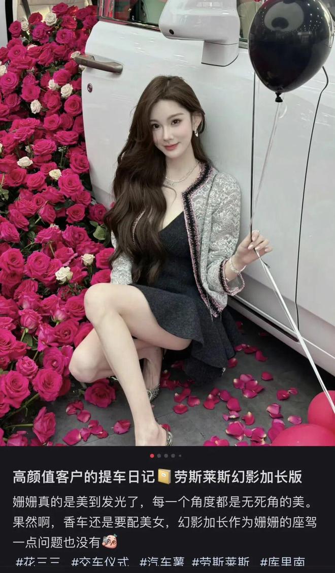2023年12月,壹位車行銷售在小紅書曬出知名網紅花叁叁喜提壹輛白色加長限量版勞斯萊斯幻影,售價大約在1300萬左右。